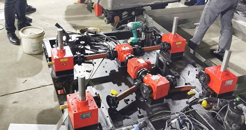 多台聯動絲杆升(shēng)降機平台,電機在(zài)中(zhōng)間,電機連接轉向箱(xiāng)或者K係(xì)列減速機,在通過連接杆和···