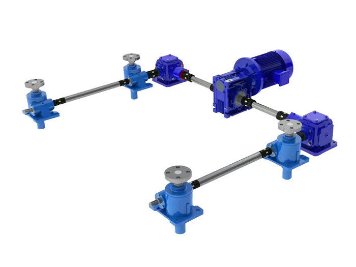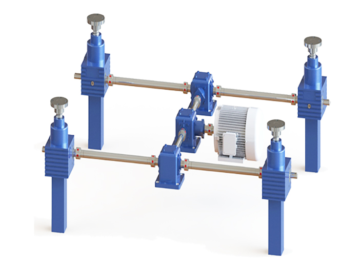 多台聯動絲杆升降機平台,電機在中間,電機連接轉向箱(xiāng)或者K係列減速機,在通過連接杆和···