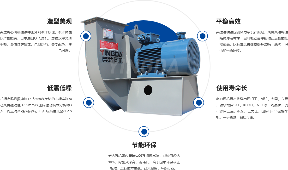 風(fēng)機葉輪、機(jī)殼可選用優質Q235碳鋼,304不鏽鋼,玻璃鋼纖維,全部模具(jù)化生產,采用電焊(hàn)、手段(duàn),表麵清潔平整、不存在焊接變形現象,葉輪經動、靜平(píng)衡校正,其平衡精度不大於4.0級。
