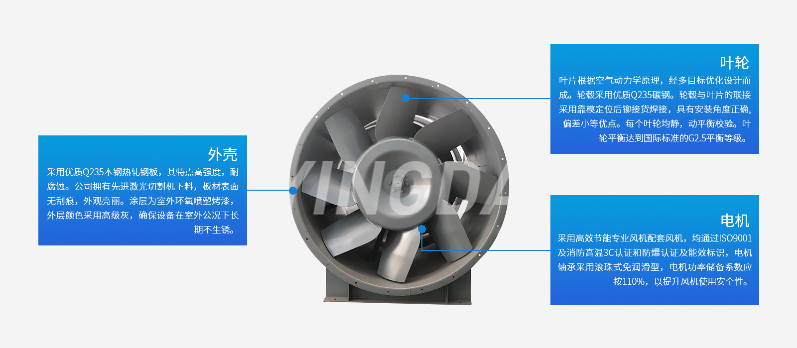 為適應防爆環境需(xū)要(yào),風機可做(zuò)成防爆風機,防爆等級(jí)為EXdⅡBT4,適用於易燃、易爆氣(qì)體的場(chǎng)所。整機通過國家防爆認證。