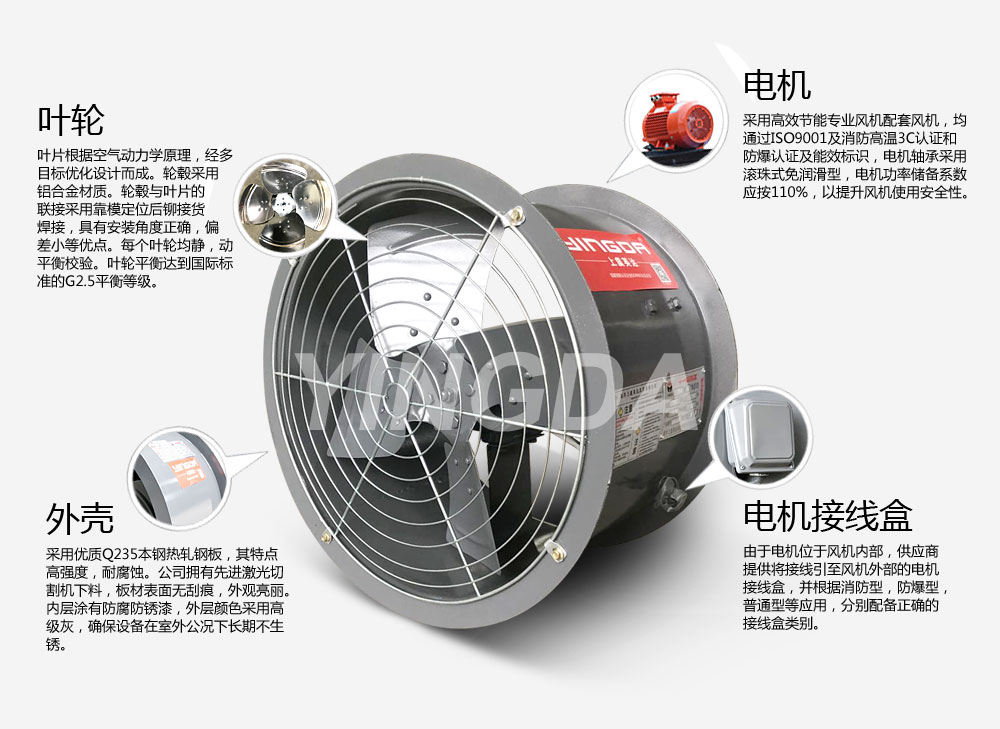 ——防爆型:電(diàn)機為隔爆型、葉片為鋁合金,適用(yòng)於易燃、易爆氣體的環境中,防爆等級為EXdIIBT4、EXdIICT4。