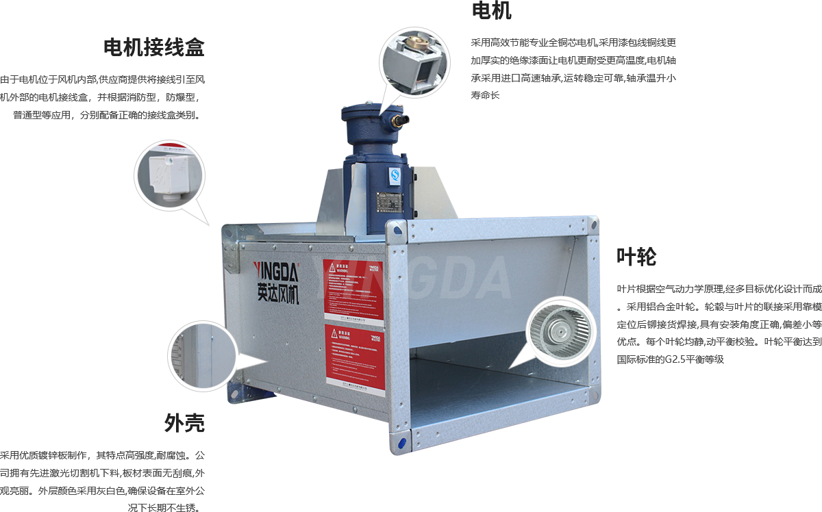 由於電機位於風機內部,供應商應提供將接線引至(zhì)風機外部的電機接線盒,並根據消防型、防爆(bào)型(xíng)、普通型等(děng)應用,分別配備正確的接線盒類(lèi)型。