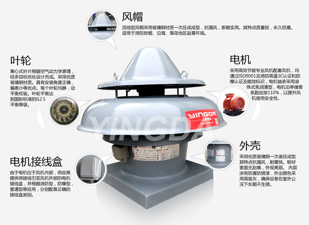 1.1.DWT-II型玻璃鋼離心式屋頂風機,其(qí)葉輪采用(yòng)離心式葉輪,可適用風量小而壓力較高的場所;采用單(dān)層風帽。