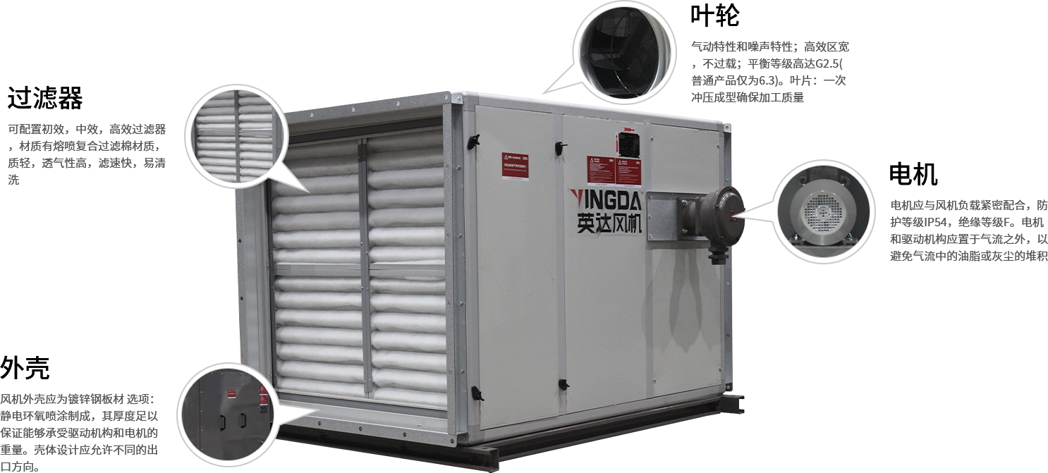 風機可加配初效、中效(xiào)或高效過濾器,以提高空氣的清潔度,配(pèi)置過濾器時應(yīng)考(kǎo)慮實際壓力(lì)損耗並需(xū)適當增加箱體長度。