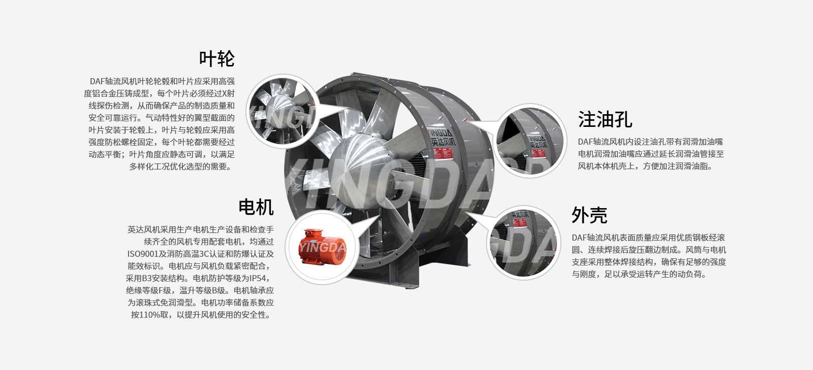 3. 按照《ISO 13350工業通風機、射(shè)流(liú)風機的(de)性能(néng)試驗》標準進行隧道射流風機推力測試。確保了91香蕉视频污污產品 研發的(de)高效、質量把控的可(kě)靠,提升(shēng)了技術數據的準確性和(hé)真實性。生產製造· 工藝及設備是可靠性的保障英 達關(guān)鍵工序點: