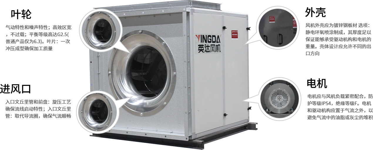 風機外殼應(yīng)為鍍鋅鋼板材[選項:靜電環氧噴塗(tú)]製成,其厚度足以保證能夠承受驅動機構和(hé)電機的重量。殼體設(shè)計(jì)應允許不同的出口方(fāng)向。